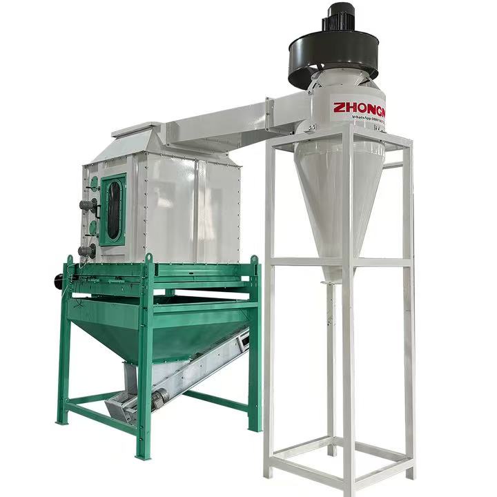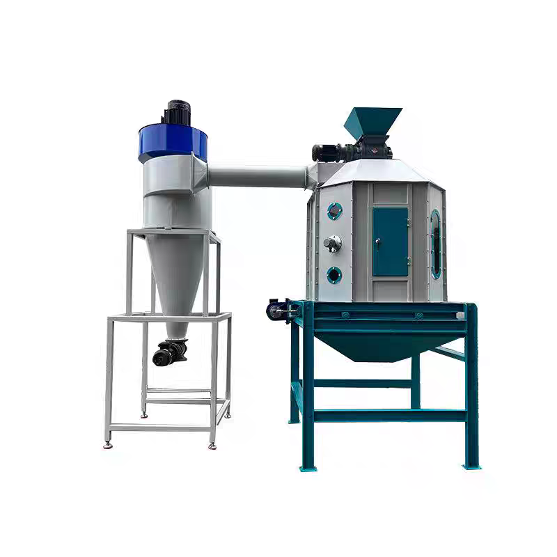 Feed Counter-Flow Cooler adopts the principle of counterflow cooling, the pellets are cooled and evenly distributed; the unique sliding valve type discharging mechanism is used for discharging; the sliding valve type discharging mechanism is stable and reliable, and the discharging is smooth; the temperature of the pellet after cooling is not higher than room temperature. +3-5 degrees. An access door is provided on the front of the unit for convenient daily maintenance and overhaul. An observation window is provided on the side for easy observation of the thickness of the material layer in the chamber.